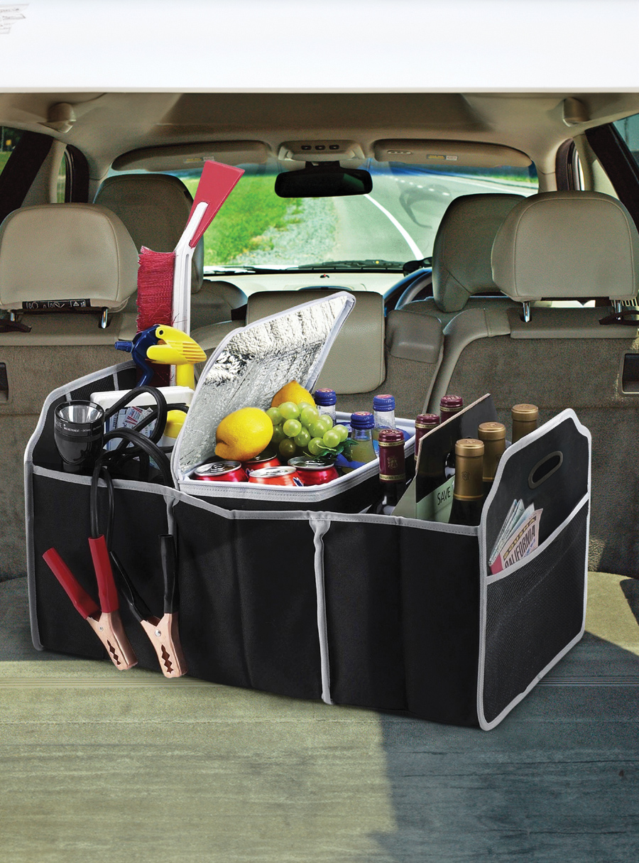 Keep your car boot neat and tidy with this easy-to-use collapsible organiser and built-in and removeable cooler bag. It has three spacious sections, perfect for groceries, cleaning supplies or travel essentials. The organiser stands upright on its own and folds flat when not in use, making it simple to store. A strong poly-canvas build and leak-proof insulated cooler help keep food and drinks at just the right temperature. With added outer mesh pockets for maps or documents, it’s a practical solution for staying organised on the go.