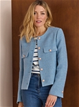 Textured collarless tweed jacket with faux pockets and soft gold buttons, feminine and casual. 80% Polyester, 20% Wool.