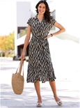 Wonderfully light summer dress with a trendy leaf print in harmonious natural colours. With a shirt collar and open V-neckline. Dropped shoulders and full-length button placket. Slight gathering at the waist seam. Narrow belt loops, with a wide, detachable tie belt. Cuts a beautiful figure even without a belt. Skirt section in a beautifully swinging A-shape with flounce at the hem. 100% Viscose.