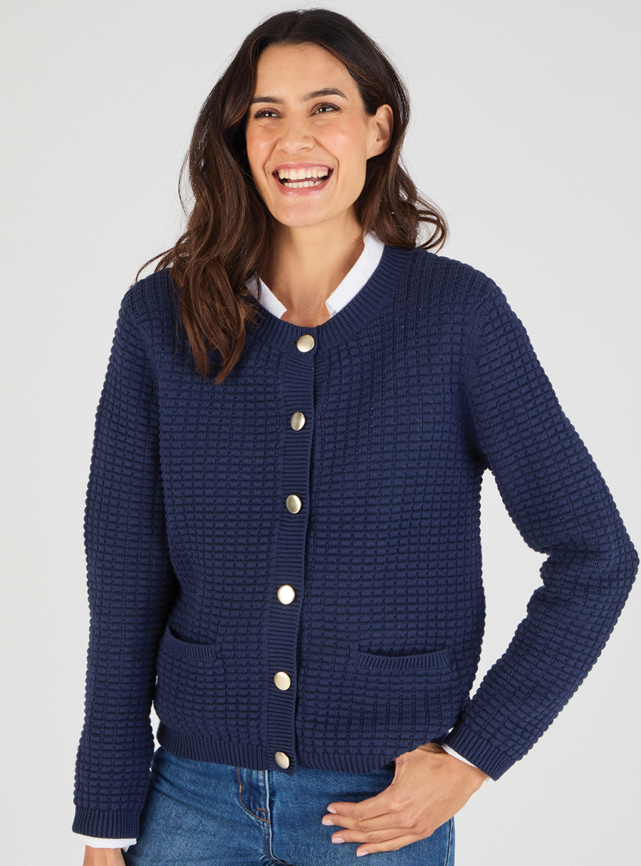 Cotton textured cardigan with front pockets and metal buttons. 100% Cotton.