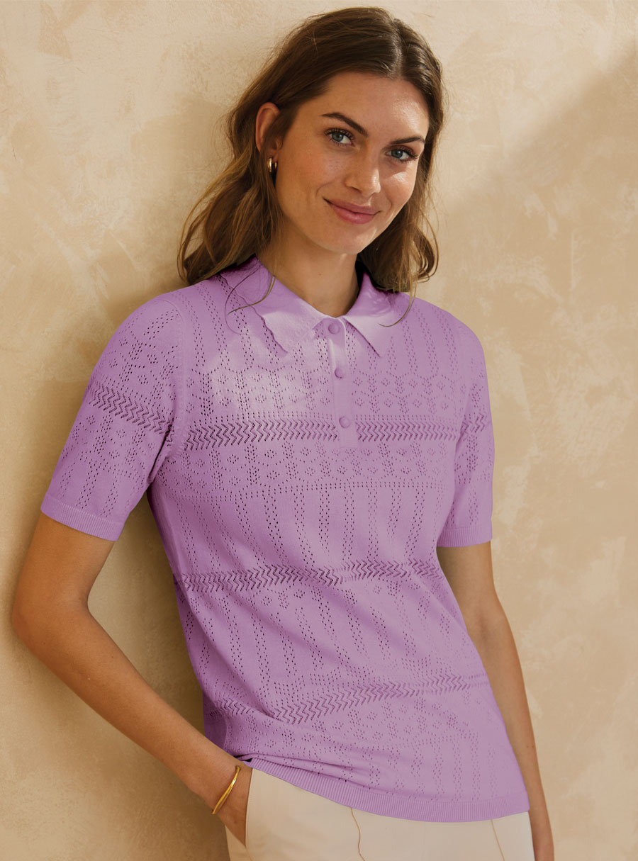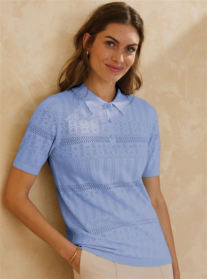 A casual and sporty polo in a pretty pointelle knit. This top has a short button placket and polo collar. Short sleeves and made in a cotton mix for comfortable all day wear. Featuring a lovely pointelle knit for design. 83% Cotton, 17% Nylon.