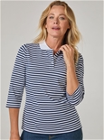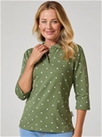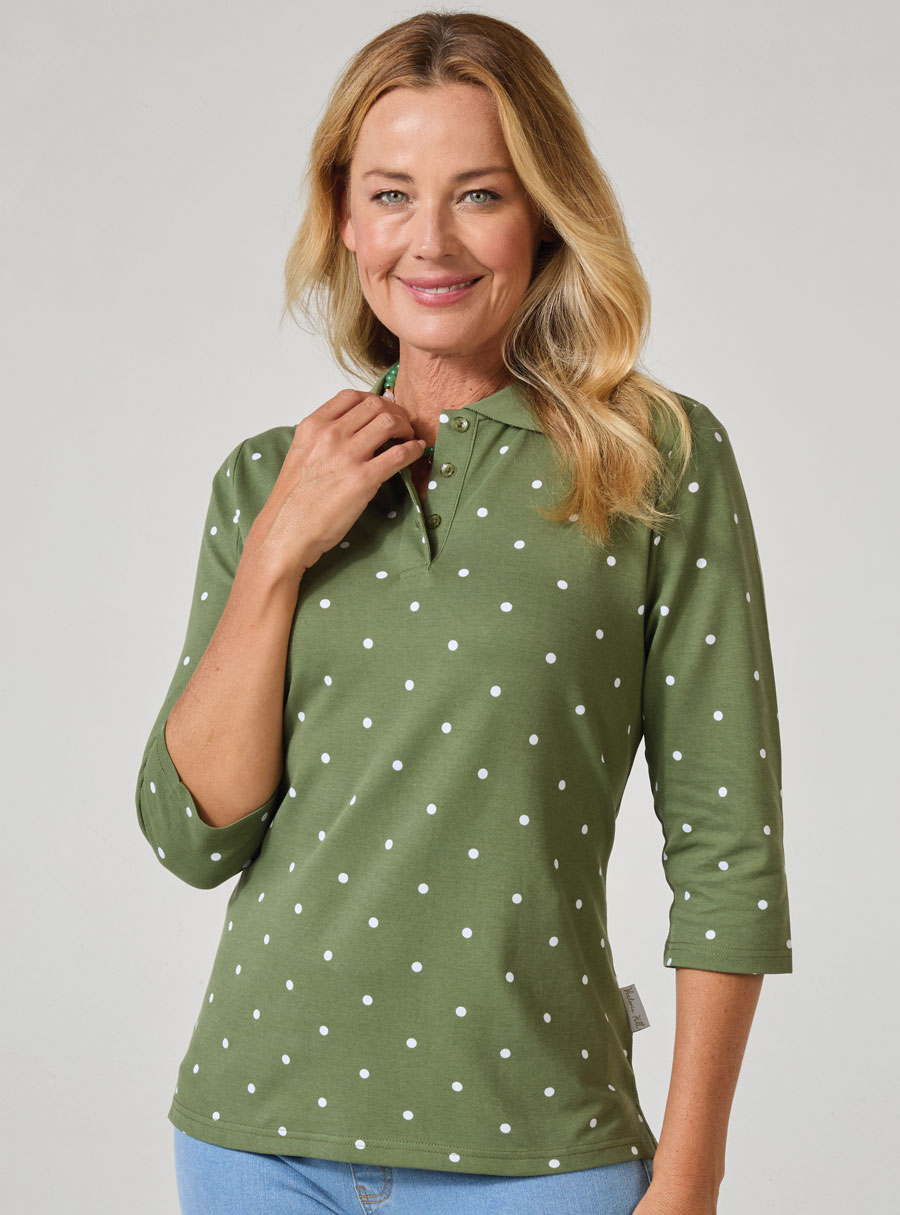 The classic polo collar and button placket give it a smart, polished look, while the all‑over print adds a touch of personality. With versatile 3/4 sleeves, this top is perfect for layering or wearing on its own across seasons.