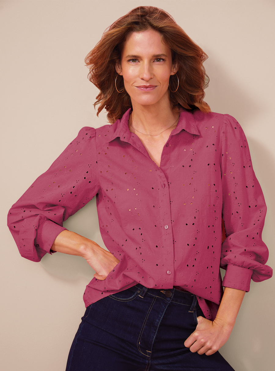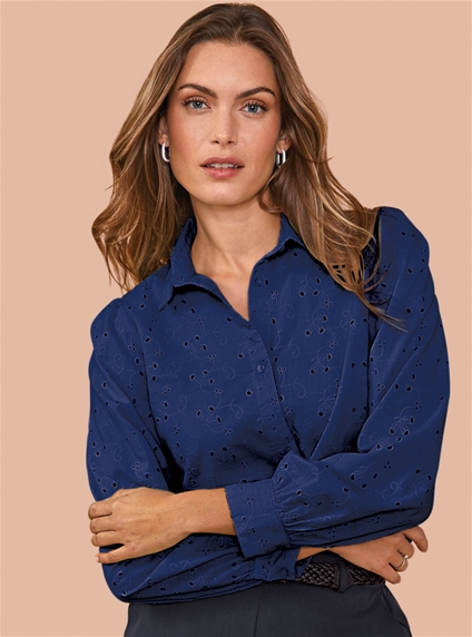 A soft and light blouse with a stylish broderie design. This top is perfect to dress up or down depending on your occasion. A shirt collar, front button placket and long sleeves with classic button cuffs. 100% Cotton.