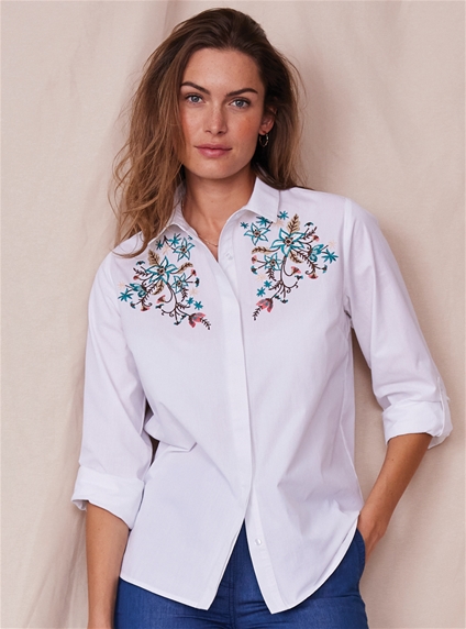 Crafted from 100% cotton, this long-sleeve shirt features roll-tab sleeves and delicate floral embroidery for a polished yet relaxed look. Perfect for effortless everyday style. 100% Cotton.