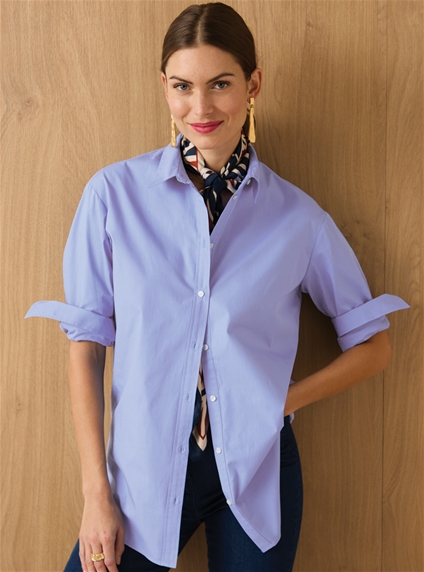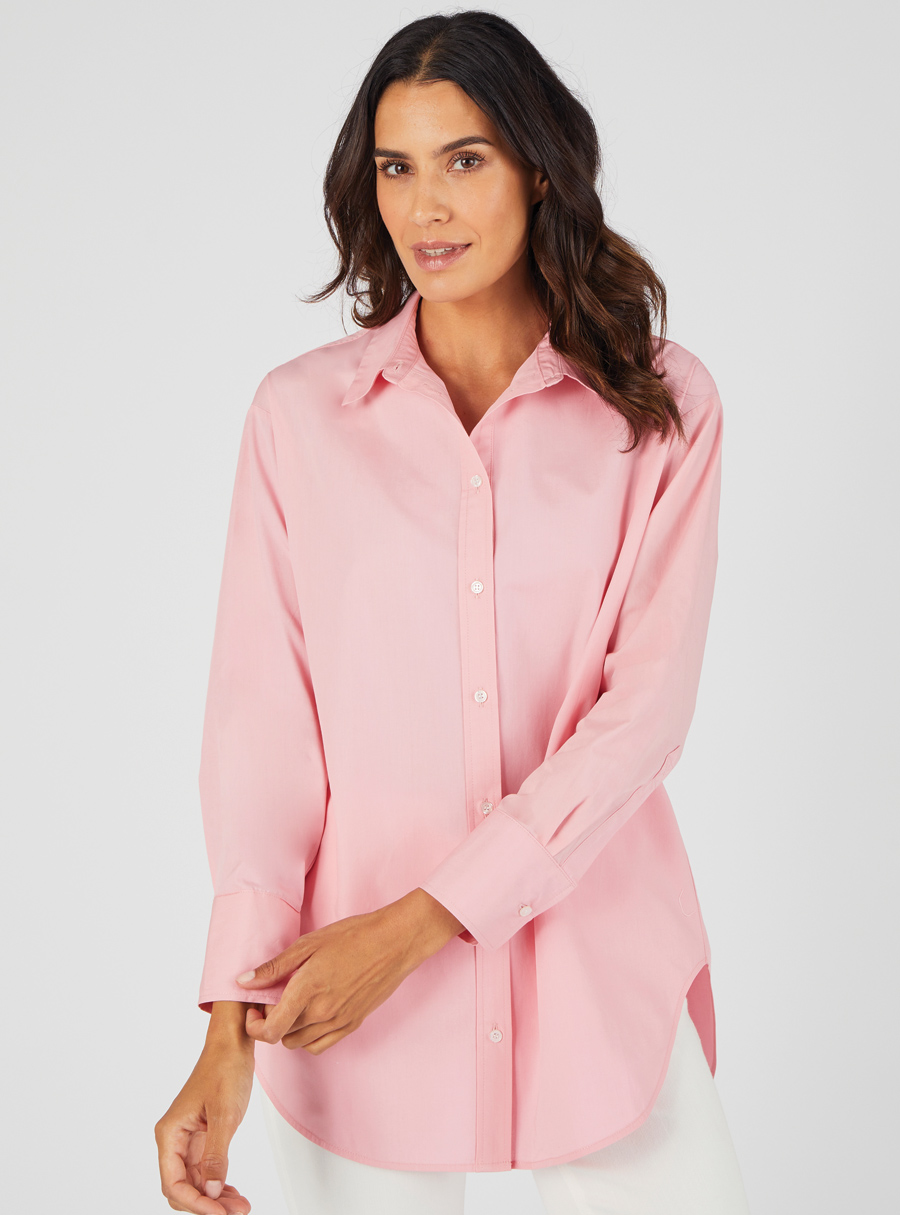 Pure cotton longline shirt with scoop front and back hem. Comes in a range of soft feminine colours. 100% Cotton.