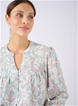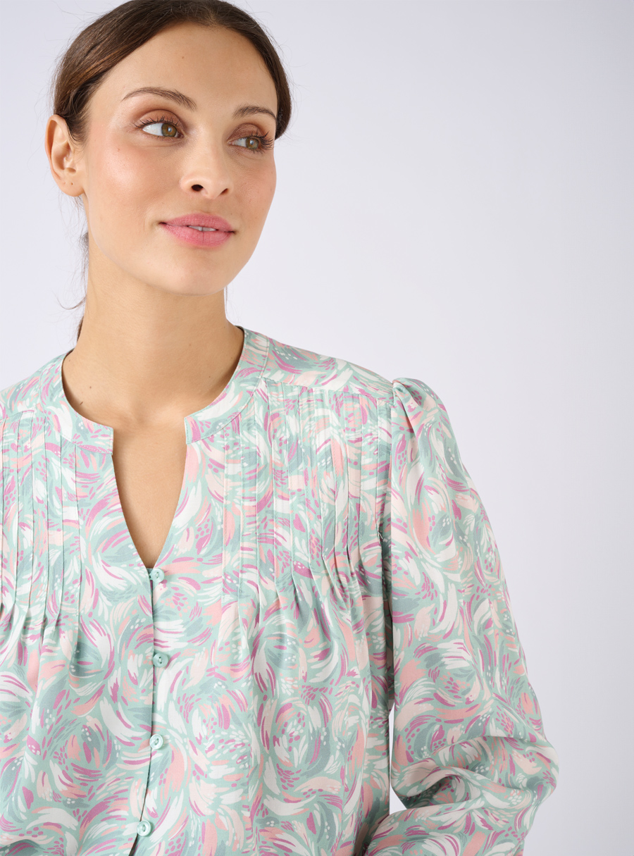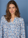 Split collar printed blouse with elastic sleeve cuffs in pretty feminine prints. 100% Viscose.