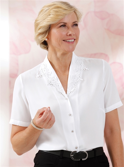 The elaborate lace trim on the shawl collar gives this blouse its charm. Button placket with jewel-like buttons. Shaping bust darts and side slits for a flattering fit. Easy-care fabric. 100% Polyester.