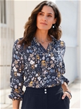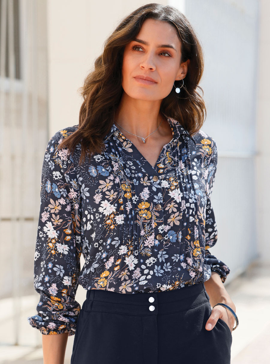 The slip-on blouse is printed with flowers all over. It features a shirt collar and V-neck, as well as pintucks on both sides around the short button placket. Long sleeves with elasticated cuffs. Back with shoulder yoke and box pleat for extra width. Slightly rounded hem. 100% Viscose.