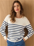 Soft touch yarn sweater with a feminine pointelle detail. Stripes give it a casual feeling. 69% Polyester, 20% Acrylic, 8% Wool, 3% Elastane.