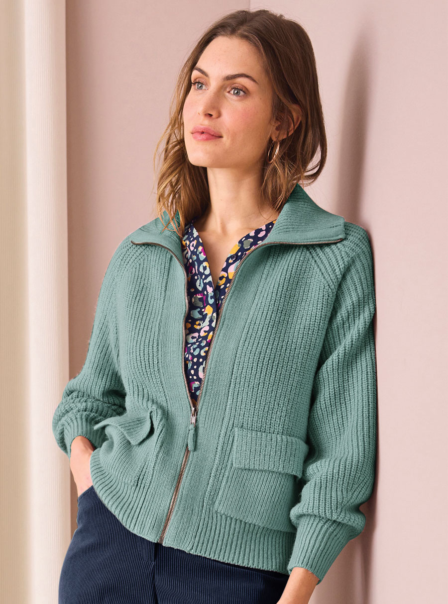 This zipped sweater offers warmth and comfort with its Thermolactyl® knit. Featuring ribbed textures, a stand-up collar and two flap patch pockets, it’s ideal for lounging or casual wear. 88% Acrylic, 12% Polyester.