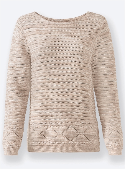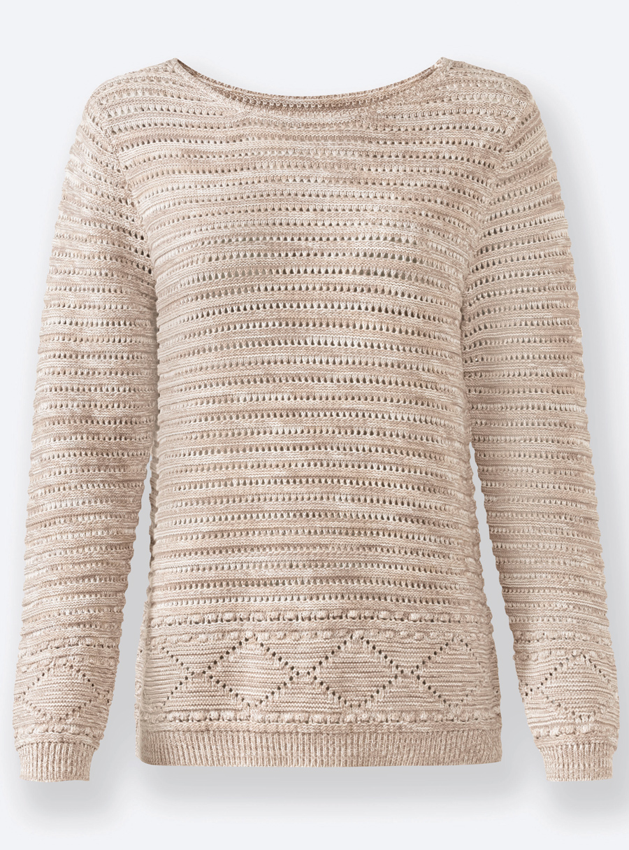 Pure cotton in summer quality: this sweater with an airy, slightly open ajour pattern mix and multi-coloured melange yarn is an instant hit. With a boat neckline and ribbed cuffs and hem. 100% Cotton.