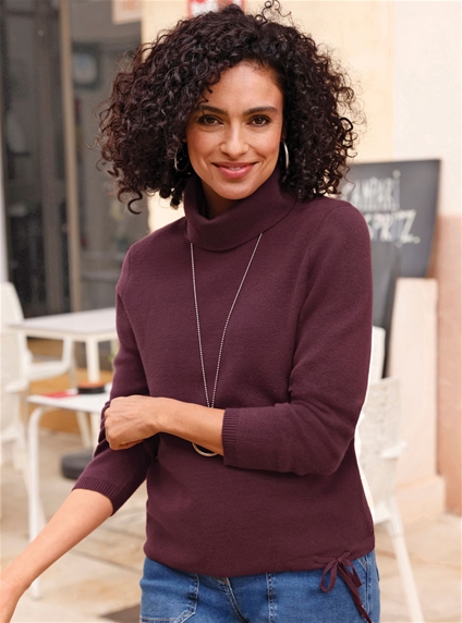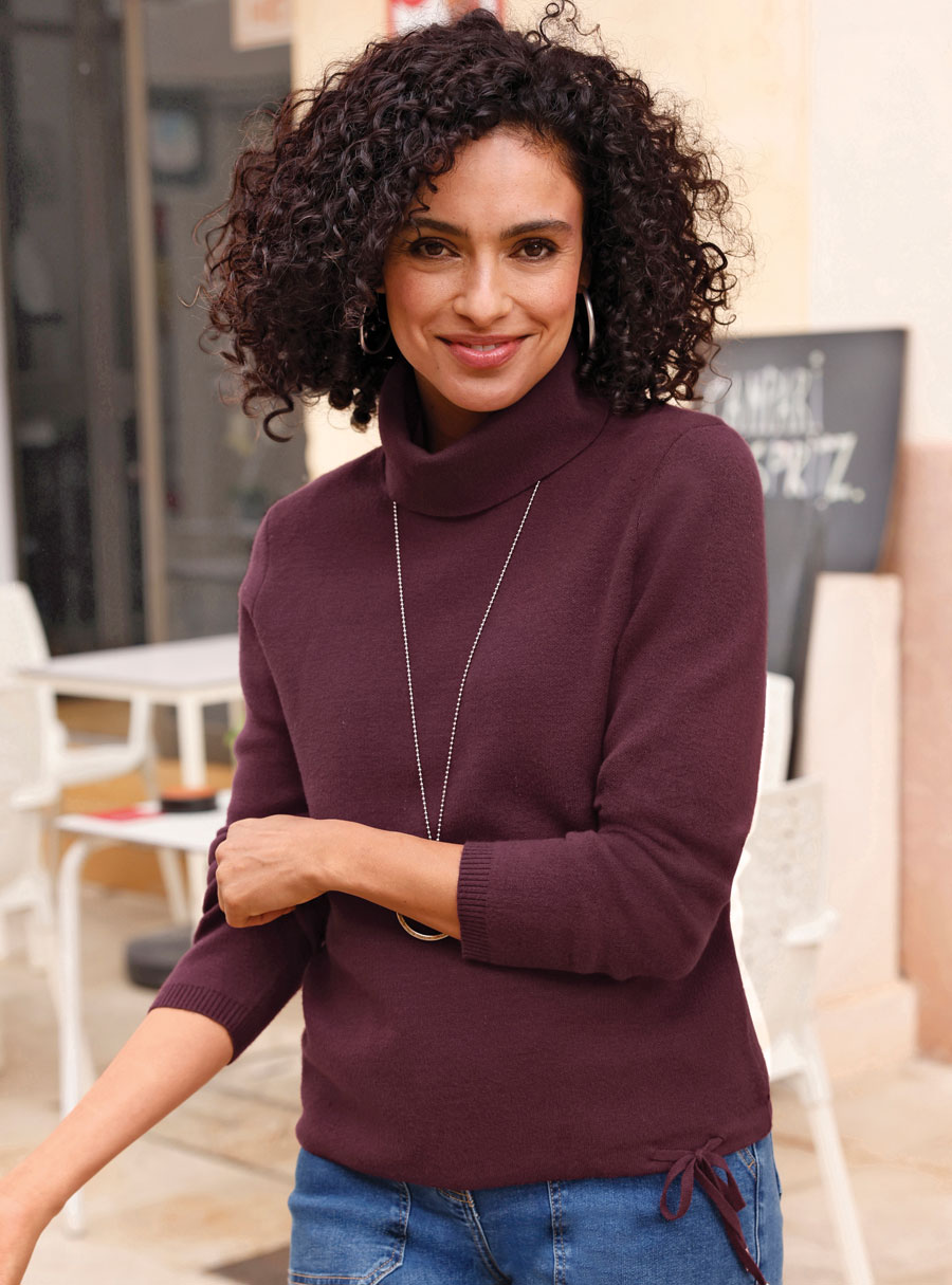 This sweater is the perfect combination of soft, lightweight, and shape-retaining fabric and a trendy shape. With a turtleneck, long sleeves, and a drawstring in the hem with a tie at the side.