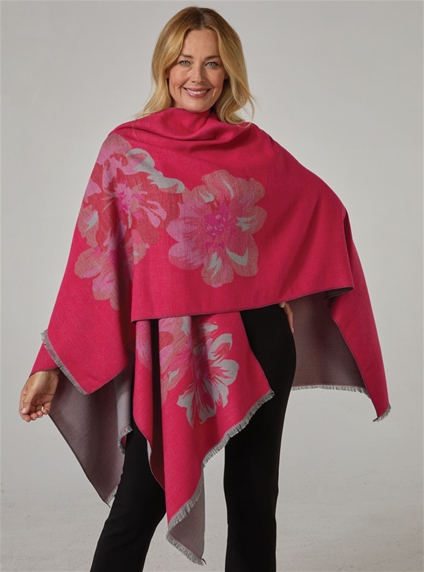 Reversible poncho style shawl with bold floral detailing in contrast colours, offering a versatile and elegant layer.