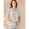 This loose-fitting tunic is flattering on anyone thanks to the flowy viscose. A round neckline with a V and ¾ length sleeves. Adorned with an all-over floral print, pintucks for shape and a short button placket. 100% Viscose.